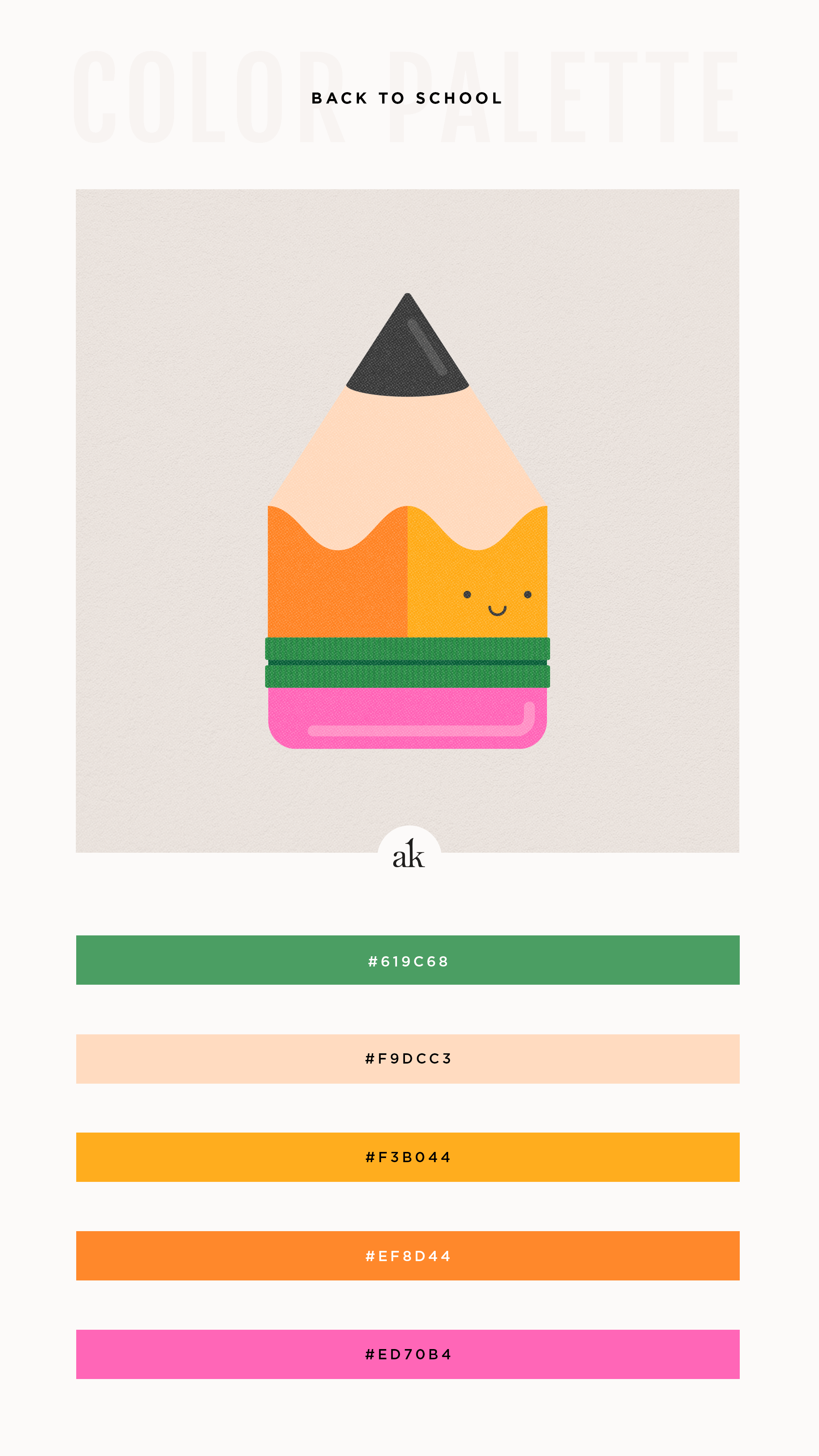 To celebrate the beginning of a new school year, I created a young and energetic color palette based on a classic no. 2 pencil. It features “ferrule” green, cedar (a peachy, wood hue), yellow, orange, and eraser pink.