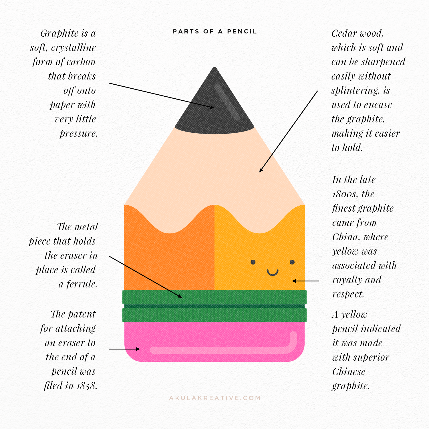 ICYDK :: a ferrule is the metal part that connects the eraser to the pencil. I had no idea until I looked it up today. Of course, googling “what is the metal part of a pencil called” led me down a rabbit hole of random pencil facts that I decided to turn into a mini diagram: